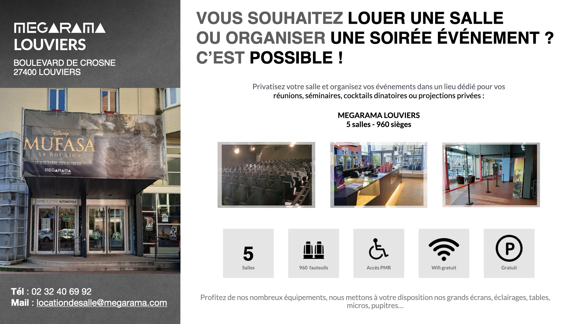 Pour toute demande de location de salle, nous vous invitons à nous contacter par e-mail à l'adresse locationdesalle@megarama.com en nous indiquant les informations suivantes :